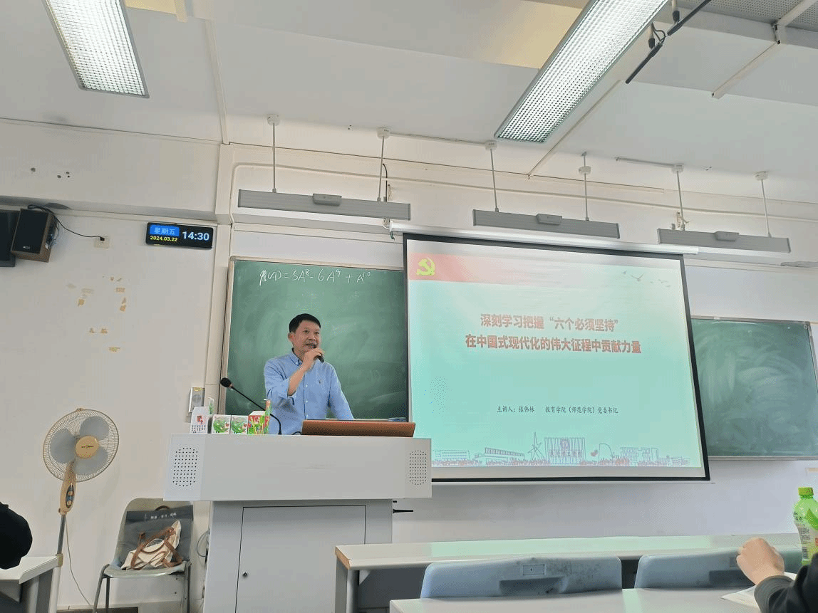 张伟林书记通过提问的方式引出“六个必须坚持”,强调“六个必须坚持”的重要性,并对“六个必须坚持”一一进行详细的解读。张伟林书记强调,新时代新青年需要时刻意识到自己肩负的社会责任,要坚持道路自信、制度自信、理论自信、文化自信,发扬知行合一、求真务实、与时俱进的精神,秉持守正创新、登高致远的理念,践行以卓越的创新教育实践造福社会。接着,张伟林书记引用俄乌冲突、巴比冲突等热点问题来勉励同学做到“立大志明大德,成大者担大任”,要关心国家大事和民族命运,把握时代机遇,利用自身专业优势为国家、民族的发展做出贡献。
