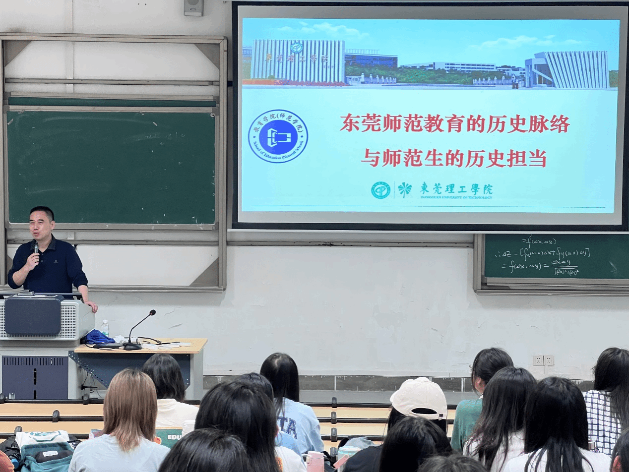 2024年3月25日,余意经理在松山湖校区综合楼6F101为2023级小学教育1班、汉语言文学(师范)1班和汉语言文学(师范)2班的同学们讲授主题为 “东莞师范教育的历史脉络与师范生的历史担当”思政第一课。