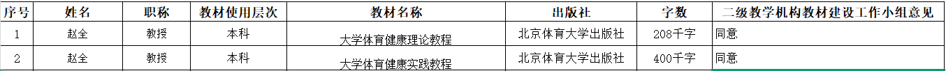 经伟德国际1946教材建设工作小组审查, 《大学体育健康理论教程》、《大学体育健康实践教程》教材编写符合公司教材编写人员条件,拟同意其开展相关教材编写工作, 现予以公示,具体信息如下:
