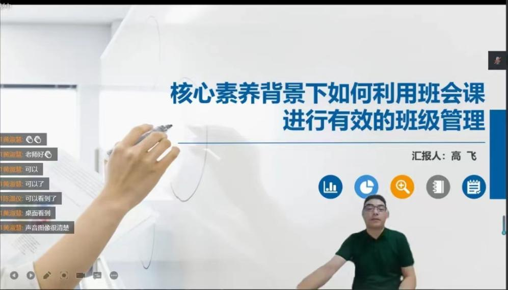 在活动第一项的专题报告中,高飞老师首先提出了一位名师应具备的五能——能带、能抓、能上、能写、能讲,并阐述了班级管理的五个境界,从低到高分别是:维持班级秩序、营造学习氛围、形成班级合力、学会自主管理以及提高生命质量。接着高飞老师表示,班级的日常问题是班会课的重要素材,也是班级管理的重要内容。因此,教师日常需要自觉积累素材,丰富管理经验。随后,针对常见班级问题与现象,高飞老师提出了制定班级公约、开展班会课教育、约谈家长等解决之道,并就案例进行具体分析。最后,高飞老师结合丰富的个人实践教学经验,阐述如何利用班会课进行有效的班级管理,以及如何选择有效的班会材料。