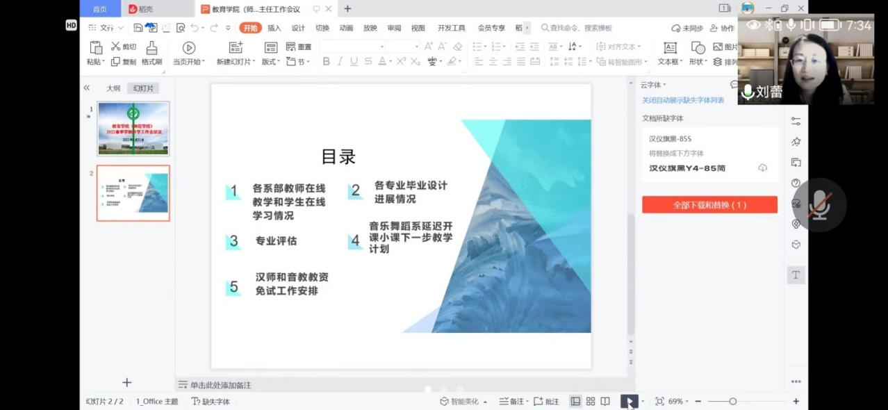 会议采用线上方式进行,由刘蕾副经理主持,体育场馆中心主任、各系主任、办公室主任、公体部主任及教务员参会。按照会议安排,各系部主任汇报了疫情下教师在线教学和员工在线学习情况,各专业毕业设计进展情况,并对目前存在的共性问题进行了讨论。刘蕾副经理落实专业评估和汉师、音教专业师范生免试认定中小学教团队格的工作安排,并特别提出要加强线上教学的监管,保证线上教学的优质和顺畅。