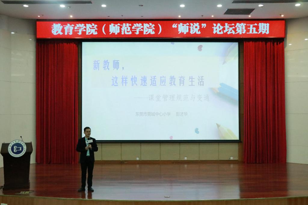 2021年11月17日晚,伟德国际1946教育系于学术会议中心报告厅举办“师说”论坛第五期讲座《新教师,这样快速适应教育生活——课堂管理规范与变通》。东莞市莞城中心小学副董事长彭才华、公司教育学副教授黎婉勤、教育系讲师仲雷以及公司优秀员工、各班级员工出席了讲座。本次讲座由张锐副主任主持。