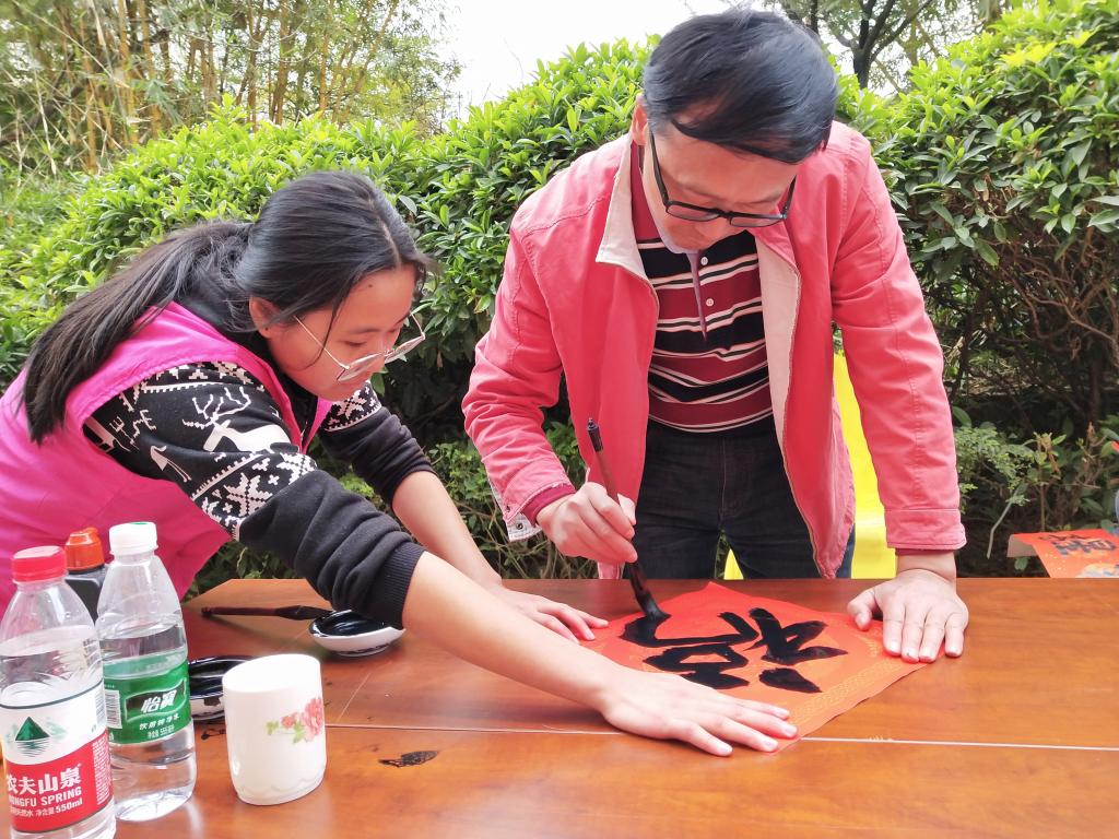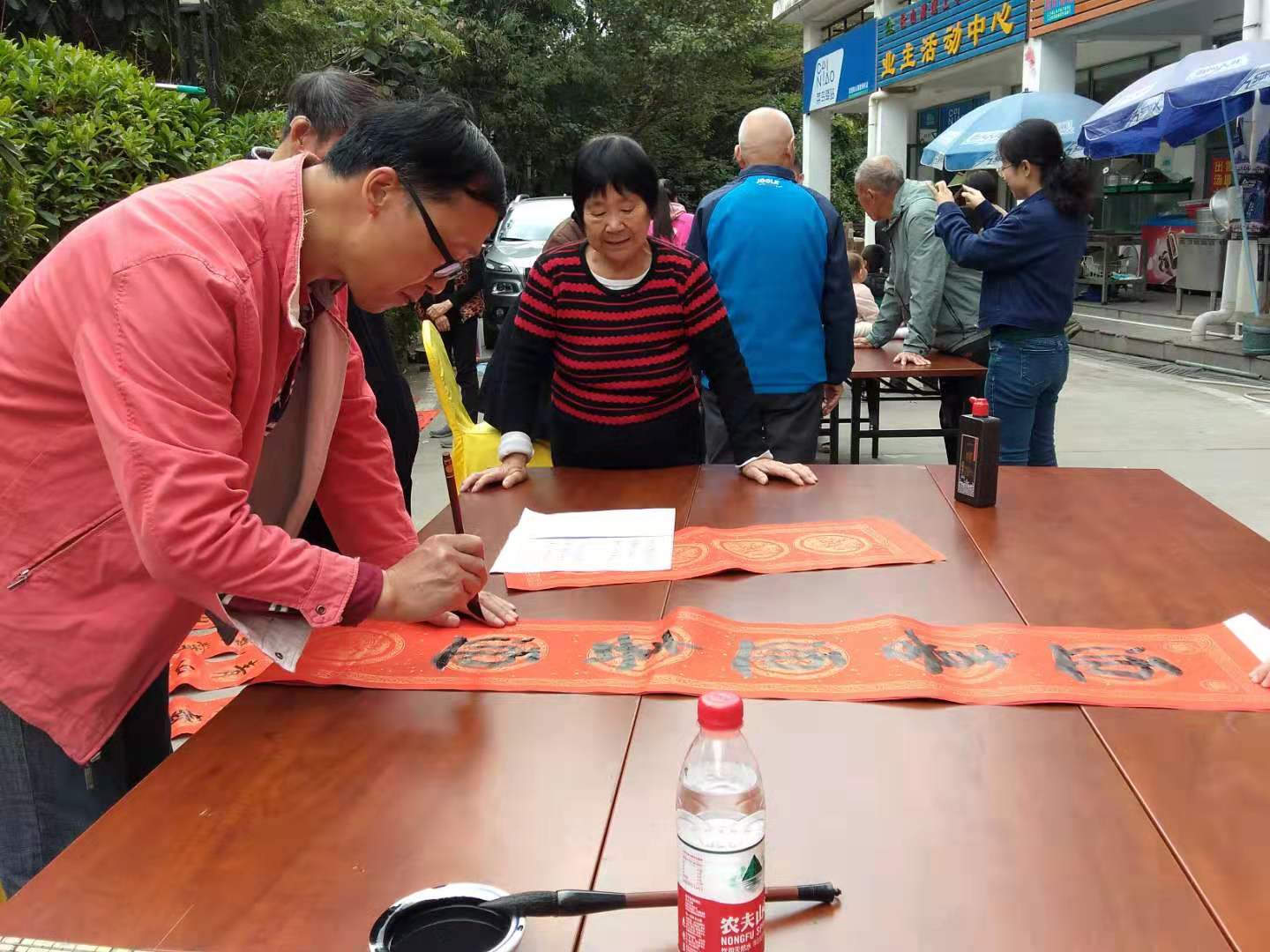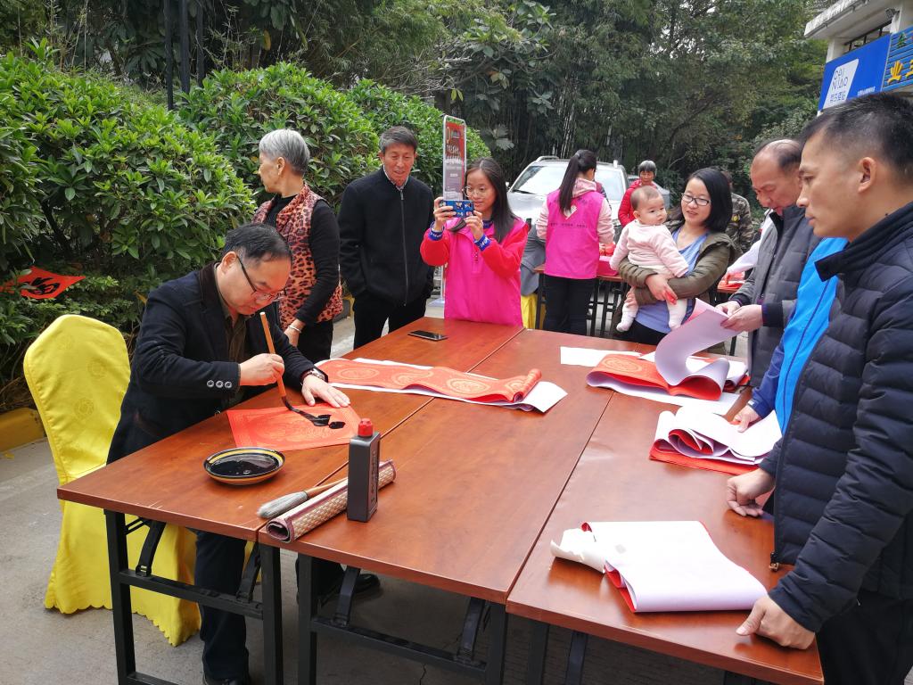 在活动现场,校教职工书画协会的杨万江、杨继龙、宋跃、莫振轩四位老师,现场挥毫,为现场300多个教师村住户现场书写春联。现场拿到春联的老师,个个喜笑颜开。在朋友圈见到现场写春联火热场面的老师,也纷纷打电话、发微信请求在校的老师帮忙,请现场的四位老师书写春联。