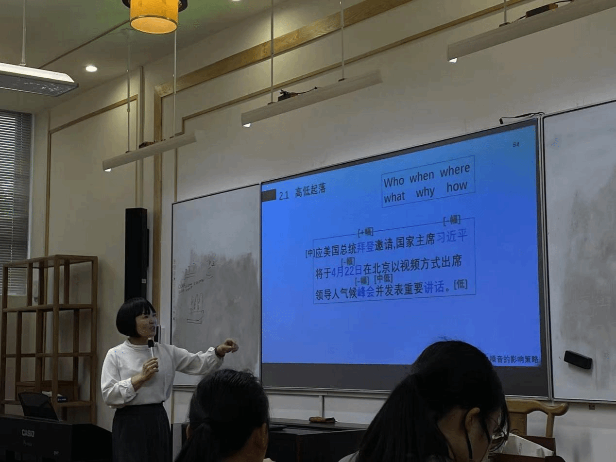 李教授现场邀请几位同学通过朗读主持稿进行针对性的指导,她耐心地指出同学们字词之间的连贯、节奏快慢,以及语气温度等等配合问题,并予以纠正。